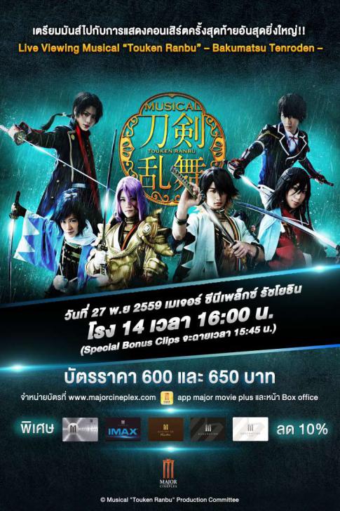 หนัง Musical Touken Ranbu เมเจอร์ ซีนีเพล็กซ์ ส่งตรงจากต่างประเทศสู่โรงภาพยนตร์เป็นรายแรกในเมืองไทย ตอกย้ำความสำเร็จในการขยายตลาดคอนเสิร์ตในโรงภาพยนตร์อย่างเต็มรูปแบบ ด้วยการถ่ายทอดสดการแสดงมิวสิคัล “Touken Ranbu” - Bakumatsu Tenrouden – Touken Ranbu (โทวเคน รันบุ) เป็นที่รู้จักในฐานะเกมออนไลน์ ที่ผู้เล่นจะต้องสวมบทบาทเป็นคนทรงที่ต้องเดินทางมายังอดีต และกำจัดเหล่าปีศาจที่คิดจะเปลี่ยนแปลงประวัติศาสตร์ โดยจะจำลองดาบที่มีชื่อเสียงในประวัติศาสตร์ญี่ปุ่นมาเป็นตัวละครหนุ่มหลากหลายคาแรคเตอร์ ปัจจุบันมีผู้เล่นมากกว่า 1 ล้านคน พร้อมชื่อที่แฟนเกมต่างพร้อมใจกันเรียกว่า “ป่วยดาบ” โดยความสำเร็จจากเกมออนไลน์ Touken Ranbu จึงถูกนำมาสร้างเป็นละครเพลง และละครเวที การแสดงมิวสิคัล “Touken Ranbu” ได้เริ่มเปิดการแสดงที่โรงละคร AiiA 2.5 ณ กรุงโตเกียว ตั้งแต่เดือนตุลาคมที่ผ่านมา เมเจอร์ ซีนีเพล็กซ์ จึงไม่พลาดที่จะเปิดโอกาสให้แฟนคลับชาวไทยได้เข้าไปสัมผัสบรรยากาศ และมีส่วนร่วมในความยิ่งใหญ่ กับการแสดงรอบสุดท้าย ที่จะถ่ายทอดสดมาให้ชมกันในโรงภาพยนตร์ เมเจอร์ ซีนีเพล็กซ์ สาขารัชโยธิน ในวันที่ 27 พฤศจิกายน 2559 โรงภาพยนตร์ที่ 14 เวลา 16.00 น. โดยจะมีการจัดฉาย Special Bonus Clips ให้ชมกันก่อนในเวลา 15.45 น. อีกด้วย สามารถจองบัตรเข้าชมผ่านช่องทางเคาน์เตอร์บ๊อกซ์ออฟฟิศ โรงภาพยนตร์เมเจอร์ซีนีเพล็กซ์ สาขารัชโยธิน / www.majorcineplex.com และแอปพลิเคชัน Major Movie Plus บัตรราคา 600 และ 650 บาท