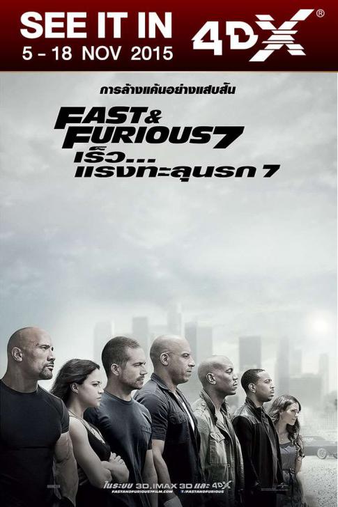หนัง Fast And Furious 7 หรือชื่อไทยว่า เร็ว..แรงทะลุนรก 7 เตรียมพบกับการกลับมาอีกครั้งของอภิมหาภาพยนตร์แอ็คชั่นทริลเลอร์แห่งปี Fast & Furious 7 เร็ว..แรงทะลุนรก 7 สุดยอดภาพยนตร์แฟรนไชส์ที่แฟนภาพยนตร์ทั่วโลกรอคอย นำแสดงโดย วิน ดีเซล, พอล วอล์กเกอร์, ดเวย์น จอห์นสัน, มิเชลล์ ร็อดดริเกซ, จอร์ดานา บริวสเตอร์,ไทรีส กิ๊บสัน, คริส บริดเจส (ลูดาคริส), เจสัน สเตแธม, โทนี่ จา และ เคิร์ท รัสเซล กำกับการแสดงโดย เจมส์ วาน หลังจากเอาชนะ โอเว่น ชอว์ (ลุค อีวานส์) และแก๊งของเขาได้ โดมินิค ทอเร็ตโต้ (วิน ดีเซล), ไบรอัน โอคอนเนอร์ (พอล วอล์คเกอร์) และพรรคพวกก็ได้เวลากลับไปยังสหรัฐอเมริกาเพื่อใช้ชีวิตอันสงบสุขอย่างที่พวกเขาฝันมาตลอดเสียที...แต่ฝันไปเถอะ! เพราะ เดคคาร์ด ชอว์ (เจสัน เสตทแธม) พี่ชายของโอเว่นเตรียมกลับมาล้างแค้น ทวงคืนชีวิตน้องชายและจัดทุกอันตรายไล่ล่าพวกเขาให้สาสม! หลังจากล่วงรู้สาเหตุการตายที่แท้จริงของฮาน ดอมและเหล่าจ้าวความเร็วทั้งหลายต่างก็ตั้งเป้าควานหาตัวฆาตกรที่ฆ่า "สมาชิกในครอบครัว" ของเขาให้จงได้ ก่อนที่มันจะตามล่าพวกเขาเจอ! ศึกของความเร็วที่จะมาซิ่งทิ้งทวนพาคุณสู่โลกของการไล่ล่าที่ยังการันตีคุณภาพเช่นเคย!
