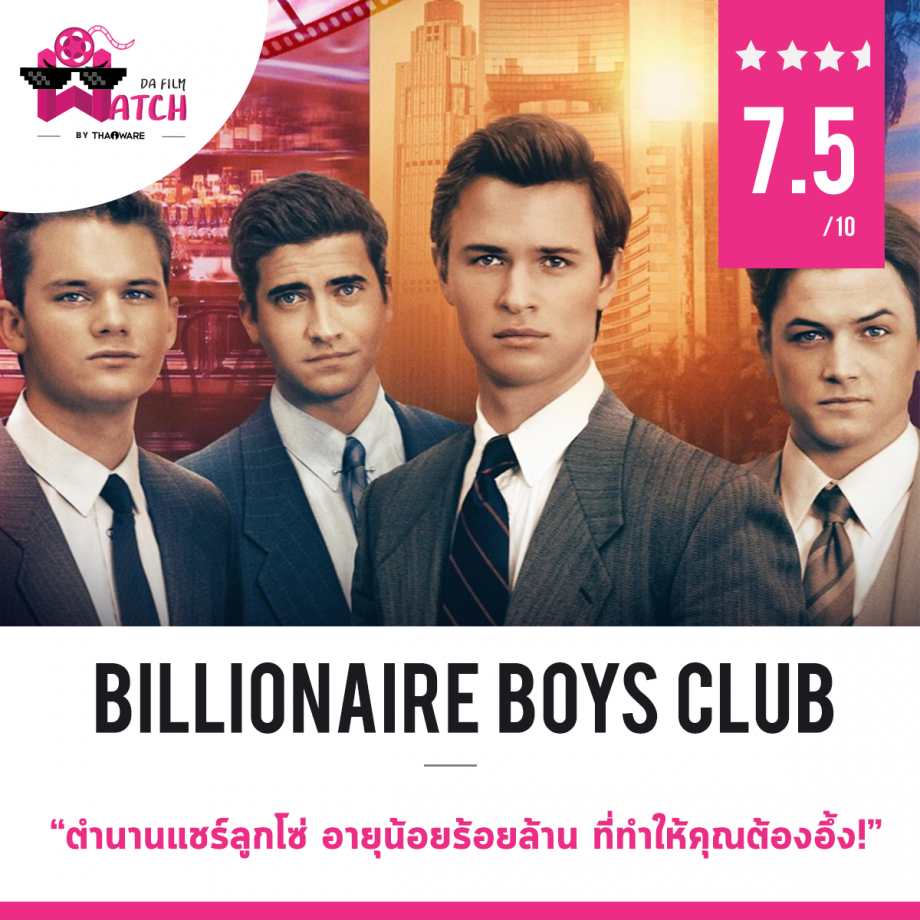 Billionaire Boys Club เป็นหนังที่สร้างมาจากคดีสุดอื้อฉาวในยุค 80 ของวัยรุ่นชายคู่หนึ่งแห่งนคร LA ณ Beverly Hills เกี่ยวกับกลุ่มเด็กวัยรุ่นที่ฝันอยากจะรวยทางลัด โดยมีแกนนำเป็น Joe Hunt (Ansel Elgort) และ Dean Karny (Taron Egerton) ได้ร่วมก่อตั้งบริษัท BBC ขึ้นมาเพื่อหลอกเหยื่อให้มาลงทุนกับบริษัทโดยจะให้ผลกำไรคืนแก่คนที่มาลงทุน หรือ “แชร์ลูกโซ่” นั่นเอง แต่แผนกลับพังไม่เป็นท่าเพราะโดนนักต้มตุ๋นอย่าง Ron Levin (Kevin Spacey) มาหลอกซะเสียเลย