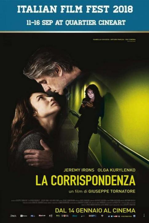 The Correspondence (Italian: La corrispondenza) is an English-language Italian romantic film directed by Giuseppe Tornatore. It stars Jeremy Irons and Olga Kurylenko in lead roles, and was released on 14 January 2016. The film score was composed by Ennio Morricone. A couple is kissing in a hotel room, astrophysics professor Ed (Jeremy Irons) and his lover the PhD student Amy Ryan (Olga Kurylenko) Amy is working as a stuntwoman, who performs dangerous scenes that normally lead to the death of the character. She keeps communicating with Ed through video chat, e-mails, and packages. One day, Amy realizes he is not attending his mobile phone but receives some emails from him. When reading the last one, she notices a maple leaf hitting her window, she watches it for a moment before it flies away. The next day, Amy attends Ed's conference, but she receives a message in her phone from Ed to leave the place, but she doesn't. She then learns that Ed died in Edinburgh some days ago. Production companies: Paco Cinematografica and Rai Cinema production Cast: Jeremy Irons, Olga Kurylenko Director:Giuseppe Tornatore Screenplay: Edoardo Falcone, Marco Martani