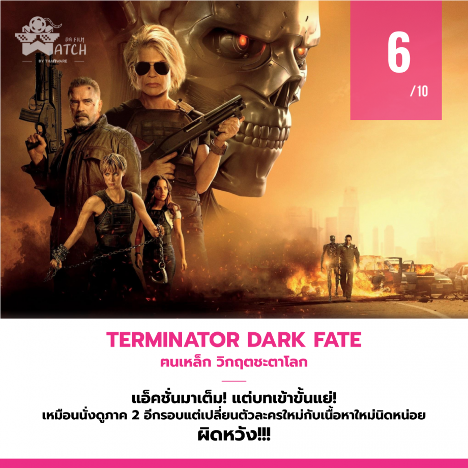 เป็นหนังที่ไม่ควรพลาดแม้แต่วินาทีแรกของหนัง เพราะฉากเด็ดอยู่ต้นๆ เรื่องเลย ใครที่เข้าสายมีร้องแน่นอน ในภาค Dark Fate นี้ได้ Linda Hamilton กลับมารับบท Sarah Connor และยังได้ Arnold Schwarzenegger กลับมารับบทคนเหล็กอีกครั้งด้วย