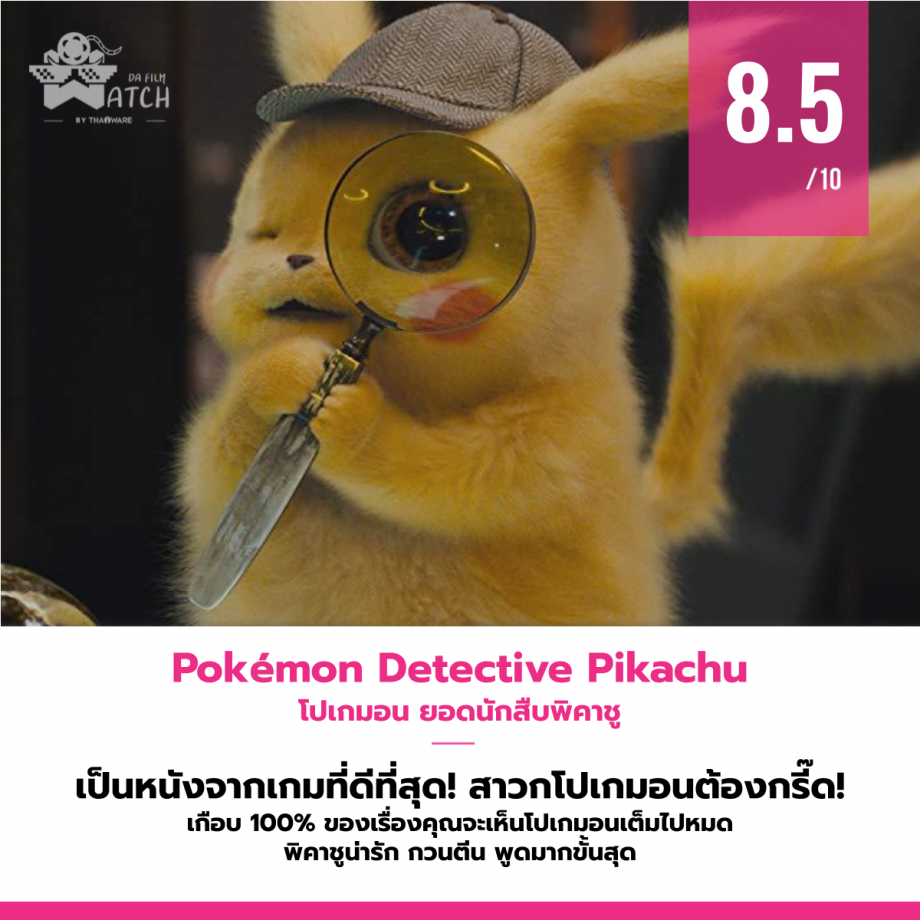 Pokémon Detective Pikachu นับว่าเป็นหนัง Live-Action เรื่องแรกของ Pokémon เลยก็ว่าได้ ที่สำคัญมันทำออกมาได้ดีเกินคาด! สนุก น่ารัก แอ็คชั่นดี และจุใจอัดแน่นไปด้วยโปเกมอน หนังถูกหยิบมาจากเกมที่ชื่อเดียวกันกับหนังบนเครื่อง 3DS ว่าด้วยเรื่องราวของ Tim Goodman กับการตามหา Harry Goodman พ่อที่หายไปของเขา โดยได้รับความช่วยเหลือจากพิคาชูยอดนักสืบที่จะมาคอยสืบเสาะและตามหาเบาะแสในเมืองที่เต็มไปด้วยโปเกมอนอย่าง Ryme Citty