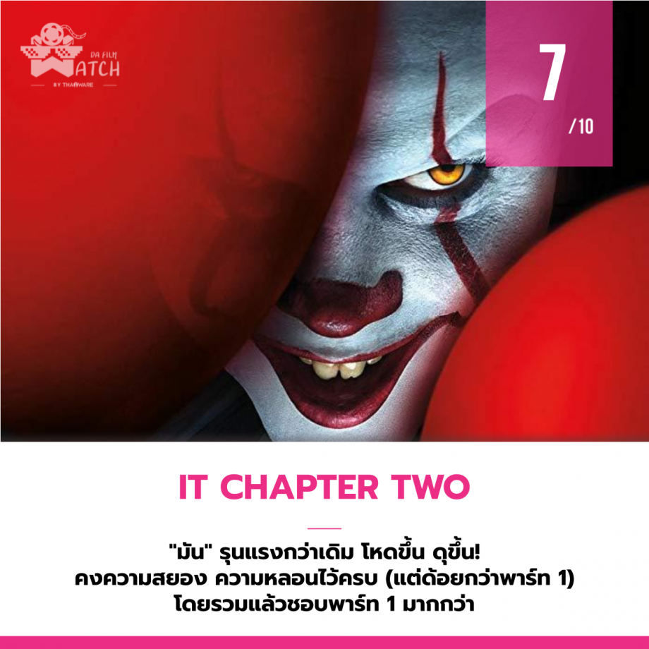 ภาพยนตร์อีกเรื่องที่ดัดแปลงจากนิยายของนักเขียนเรื่องสยองชื่อดัง Stephen King กับการ remake อีก 1 งานที่ถือว่าเป็น Iconic ของโลกแห่งภาพยนตร์สยองขวัญ ตัวตลก Pennywise ซึ่งเดินทางมาถึงพาร์ทที่ 2 ที่เป็นพาร์ทจบกับบทสรุปเรื่องราวสุดประหลาดและบ้าคลั่งในเมือง Derry ที่เด็กๆ กลุ่ม Loser Club กลับมารวมตัวกันอีกครั้งในรอบ 27 ปี เพราะมันกลับมาพร้อมกับบาดแผลที่เคยฝากไว้กับพวกเขาในอดีต