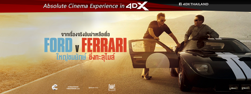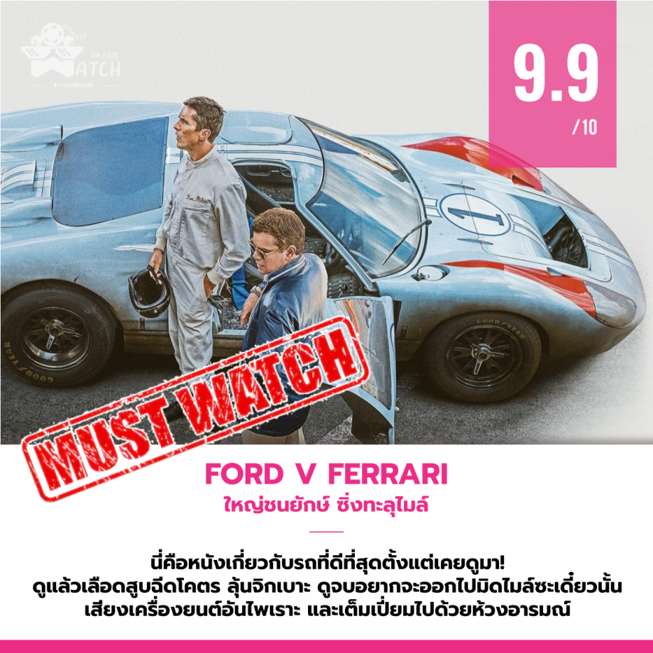 หนัง Ford V. Ferrari หรือชื่อไทยว่า ใหญ่ชนยักษ์ ซิ่งทะลุไมล์ American car designer Carroll Shelby and driver Ken Miles battle corporate interference, the laws of physics and their own personal demons to build a revolutionary race car for Ford and challenge Ferrari at the 24 Hours of Le Mans in 1966.