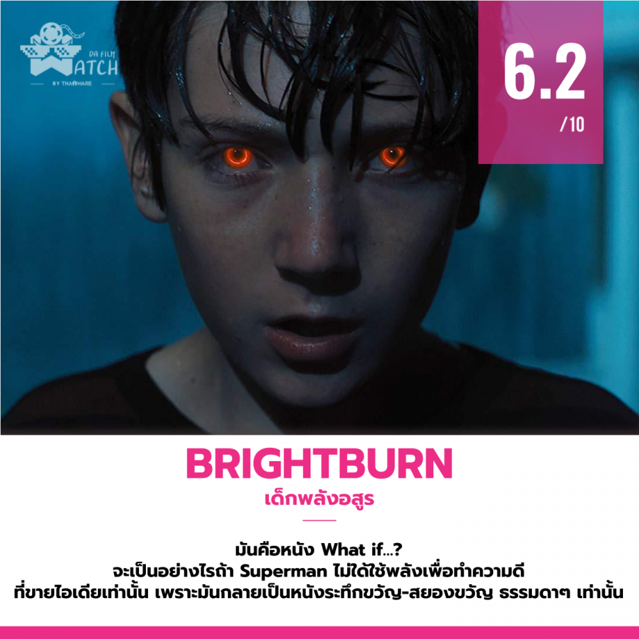ฟังๆ ดูก็คือซุปเปอร์แมนนั่นเอง ยิ่งถ้าใครได้อ่านการ์ตูน Injustice ที่ซุปเปอร์แมนกลายเป็นคนไม่ดีเพราะโลอิสหรือนางเอกตาย ก็คงอยากจะดูเรื่อง Brightburn มากขึ้น แต่!! แต่พอไปดูจริงๆมันไม่ใช่แบบที่เราคิด เพราะหนังเน้นฉากไล่ฆ่าและฉากหวาดเสียวเลือดสาด จนรู้สึกได้ว่าเนื้อเรื่องมันไม่มีอะไรเลย ที่สำคัญไม่ควรพาเด็กๆ ไปดูครับ ฉากน่ากลัวเยอะพอสมควร