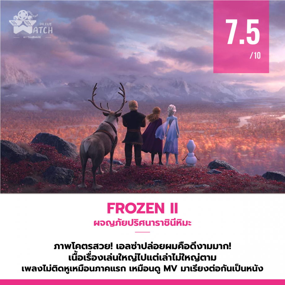 สรุปแล้ว Frozen II น่าจะทำออกมาเอาใจแฟนคลับจริงๆ นั่นแหละ คือภาคแรกเราก็ไม่ได้ประทับใจอะไรขนาดนั้น ก็เรื่อยๆ เพลินๆ แต่ชอบเพลง พอมาในภาคนี้หลายๆ อย่างมันชวนให้ไม่เอ็นจอยสักเท่าไหร่ แถมเพลงยังไม่ติดหูเหมือนภาคแรกอีก เหมือน MV เพลงเรียงต่อกันอีกต่างหาก แต่ยังมีงานภาพที่น่าจับตา โอลาฟที่คอยดึงเราอยู่บ้าง และลุคปล่อยผมของแม่นางเอลซ่า