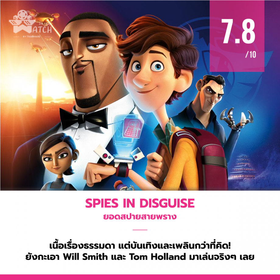 หนัง Spies in Disguise หรือชื่อไทยว่า ยอดสปายสายพราง เรื่องราวของคู่หูคู่ฮาและการออกจารกรรมข้ามชาติ แลนซ์ สเตอร์ริ่ง (วิล สมิธ) สายลับที่เจ๋งที่สุดในโลก เขาเท่ มีเสน่ห์ มีฝีมือร้ายกาจ การช่วยโลกคืออาชีพของเขา ไม่มีใครจะทำได้ดีไปกว่าเขาอีกแล้ว และ วอลเทอร์ (ทอม ฮอลแลนด์) คนที่มีจิตใจดีและแทบจะตรงข้ามกับแลนซ์โดยสิ้นเชิง ซึ่งเขาอาจไม่ใช่คนที่พูดคุยได้เก่งนัก ถึงแม้ว่าเขาจะขาดความสามารถในการเข้าสังคม แต่ความสามารถเหล่านั้นก็ถูกทดแทนด้วยความฉลาดและช่างประดิษฐ์ วอลเทอร์เป็นนักวิทยาศาสตร์อัจฉริยะผู้ประดิษฐ์อุปกรณ์ที่ใช้ในภารกิจต่าง ๆ ของเขานั่นเอง แต่เมื่อเหตุการณ์ที่ไม่คาดฝันเกิดขึ้น เมื่อทั้งสองต้องหันมาเชื่อมั่นในตัวกันและกันในแง่มุมใหม่ ๆ และนี่เองที่หากพวกเขาไม่เรียนรู้ที่จะทำงานร่วมกันเป็นทีม โลกทั้งใบอาจตกอยู่ในอันตรายใหญ่หลวง