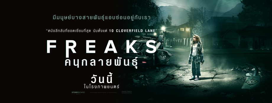 หนัง Freaks หรือชื่อไทยว่า คนกลายพันธุ์ "มีมนุษย์บางสายพันธุ์ แอบซ่อนอยู่กับเรา" เตรียมพบภาพยนตร์ไซไฟ ระทึกขวัญ ที่ได้รับการยกย่องว่าชวนช็อค! คาดเดาไม่ได้! และเซอร์ไพรส์ที่สุดประจำปี 2019 ใน ""Freaks คนกลายพันธุ์"" คว้าคะแนนจากเว็บไซต์ Rotten Tomatoes สูงถึง 90% นำแสดงโดย 'อีมิล เฮิร์ช' จาก Speed Racer และ 'บรูซ เดิร์น' จาก The Hateful Eight นี่คือเรื่องราวของลูกสาววัย 7 ขวบ โคลอี้ (เลซี่ โคลเคอร์) และพ่อของเธอ (อีมิล เฮิร์ช) ที่พยายามทำทุกอย่างเพื่อปกปิดไม่ให้เธอออกไปสัมผัสโลกภายนอก คอยบอกเธอเกี่ยวกับอันตรายที่อยู่นอกประตูบ้านหลังนั้นตลอดเวลา จนกระทั่งวันหนึ่งเธอได้รวบรวมความกล้าและตัดสินใจเปิดประตูบานนั้นออกไปเพื่อพบกับอิสรภาพ… ที่ต้องแลกมาด้วยเลือด และ ความลับที่ถูกปกปิดกำลังจะปะทุ!