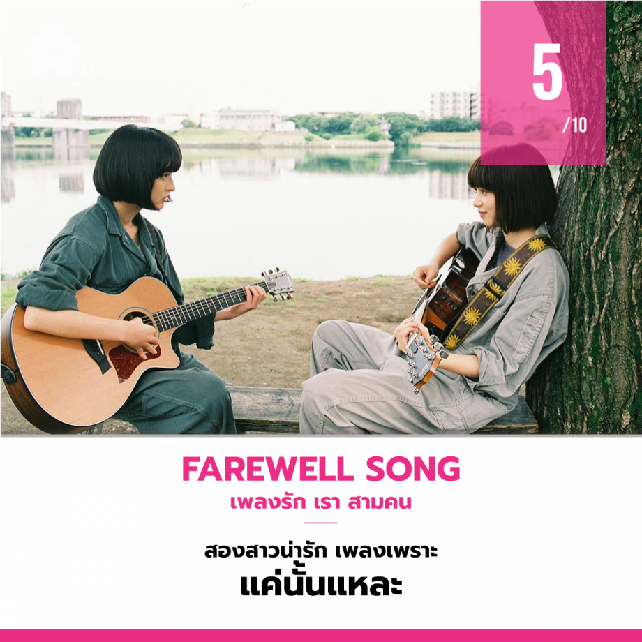 หนัง Farewell Song หรือชื่อไทยว่า เพลงรักเราสามคน โคมัตสึ นานะ X คาโดวากิ มุกิ เพราะความรักไม่ได้มีที่ว่างพอสำหรับ 3 คน Farewell Song เป็นเรื่องราวของฮารุ และ เลโอะ ที่ได้ร่วมกันฟอร์มวงดนตรีแนวอินดี้ชื่อ ฮารุเลโอะ แล้วก็เริ่มกลายเป็นวงที่โด่งดังขึ้นมา ทั้งสองตัดสินใจออกทัวร์แสดงคอนเสิร์ต ตอนนั้นเองก็ได้พบกับ ชิมะ อดีตโฮสต์เก่า ที่มาขอสมัครเป็นผู้ช่วยวง ด้วยเหตุผลว่า เขาชอบเพลงที่ฮารุเป็นคนแต่ง ทั้งสามออกทัวร์ไปด้วยกัน พร้อมกับความรู้สึกบางอย่างที่ก่อตัวขึ้นในหัวใจ ระหว่างที่วงมีชื่อเสียงขึ้นเรื่อยๆ วันหนึ่ง ฮารุ และ เลโอะ ก็ตัดสินใจจะยุบวง ฮารุเลโอะ ออกทัวร์แสดงคอนเสิร์ตด้วยกัน เป็นครั้งสุดท้ายที่ ฮาโกดาเตะ ฮอกไกโด พร้อมกับความรู้สึกแท้จริงที่ค่อยๆเปิดเผย Farewell Song นำแสดงโดย โคมัตสึ นานะ(Tomorrow I Will Date With Yesterday You(2016)), คาโดวากิ มุกิ(Innocent Curse(2017)), นาริตะ เรียว (Code Blue The Movie(2018))