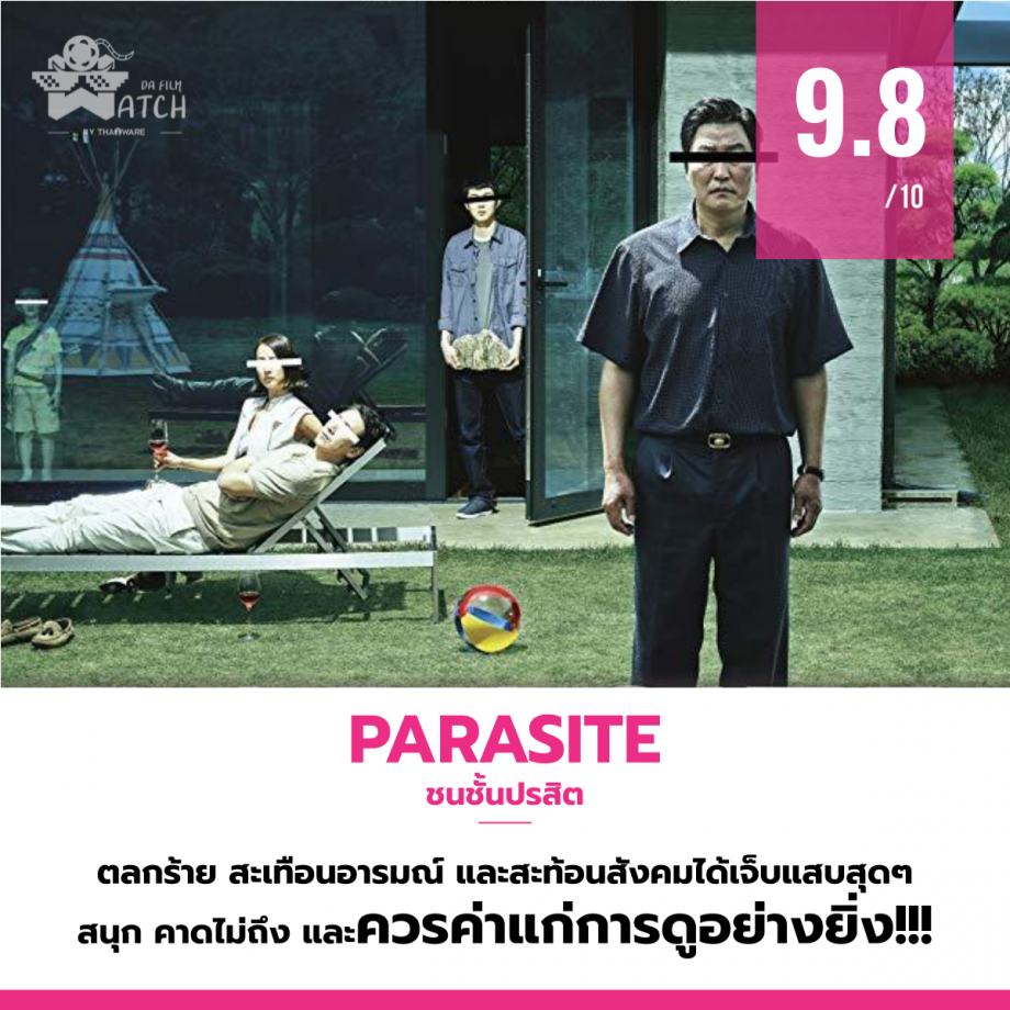 Parasite - ชนชั้นปรสิต เป็นหนังสัญชาติเกาหลีที่กำกับโดย Joon-ho Bong เจ้าตัวเคยฝากผลงานไว้อย่างน่าประทับใจหลายเรื่อง เช่น Snowpiercer, Okja และในเรื่องนี้ เจ้าตัวก็พาหนังเรื่องนี้คว้ารางวัลชนะเลิศปาล์มทองคำจากเทศกาลหนังเมืองคานส์อีกต่างหาก! นับว่าเป็นผู้กำกับยอดฝีมืออย่างแท้จริง ตอนแรกคิดว่ามันต้องเป็นหนังติสๆ ดูยากๆ พวกหนังเทศกาลเนี่ย แต่พอได้ดูแล้ว มันดูง่ายมาก ไม่ซับซ้อน แถมยังสนุกมากๆ จนอยากบอกต่ออีกต่างหาก