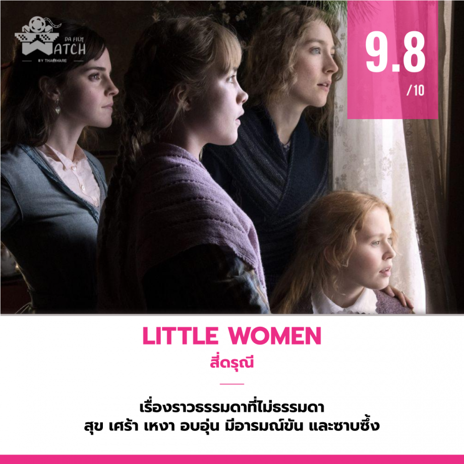 หนัง Little Women หรือชื่อไทยว่า สี่ดรุณี Little Women เป็นภาพยนตร์ที่ดัดแปลงมาจากนวนิยายชื่อเดียวกันที่ตีพิมพ์ในปี 1868 จากผลงานเขียนของนักเขียนหญิง Louisa May Alcott ว่าด้วยเรื่องราวของ 4 พี่น้องตระกูล March ที่ตัดสินใจออกจากบ้านเดิมของครอบครัวมาใช้ชีวิตกันเอง จากตัวอย่างภาพยนตร์เราจะได้เห็นว่าพวกเธอมีความฝัน Jo March (เซียร์ช่า โรแนน) อยากเป็นนักเขียน, Meg March (เอ็มม่า วัตสัน) อยากเป็นนักแสดง, Amy March (ฟลอเรนซ์ พิวจ์) อยากเป็นจิตรกร และ Beth March น้องสาวตัวน้อย สิ่งที่ทั้ง 4 คนต้องเผชิญและเป็นเหมือนกับแก่นของเรื่องก็คือ การต่อสู้กับกรอบของสังคมที่วัดความสำเร็จของผู้หญิงจากการแต่งงาน Little Women เป็นอีกหนึ่งภาพยนตร์ที่จะเล่าเรื่องราวการก้าวข้ามวัยหรือ Coming of age ของวัยรุ่นสู่การเป็นผู้ใหญ่ เพราะฉะนั้นนี่จึงไม่ใช่ภาพยนตร์ที่เหมาะสมสำหรับคนที่ชื่นชอบภาพยนตร์ดราม่าทั่ว ๆ ไปเท่านั้น แต่นี่เป็นภาพยนตร์อีกเรื่องที่น่าสนใจสำหรับเด็กผู้หญิงทุกคน เพื่อตอกย้ำให้รู้ว่าการแต่งงานไม่ใช่ตัววัดความสำเร็จหรือคุณค่าเสมอไป หลุดออกจากกรอบเก่า ๆ ไปพร้อม ๆ กันกับ Little Women 9 มกราคม 2020