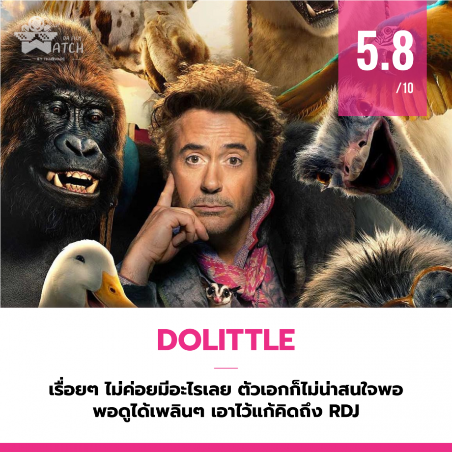 สรุปแล้ว Dolittle เป็นหนังที่ดูได้เพลินๆ ไม่ได้ถึงกับแย่ แต่ก็ไม่ได้ดี ไม่ค่อยมีอะไรให้น่าจดจำสักเท่าไหร่ น่าจะเหมาะสำหรับครอบครัวพาลูกพาหลานไปดู น่าจะเอ็นจอยมากกว่า ตัดเรื่องเหตุผล ตัดเรื่องความรู้สึกตัวละคร Dolittle ออกไป แล้วเหลือไว้เพียงแต่สิงสาราสัตว์ต่างๆ กับการผจญภัยเล็กๆ น้อยๆ ก็น่าจะพอไหวอยู่แหละมั้ง