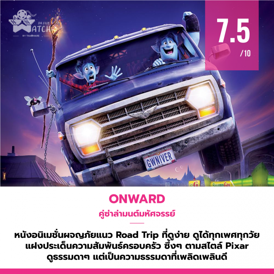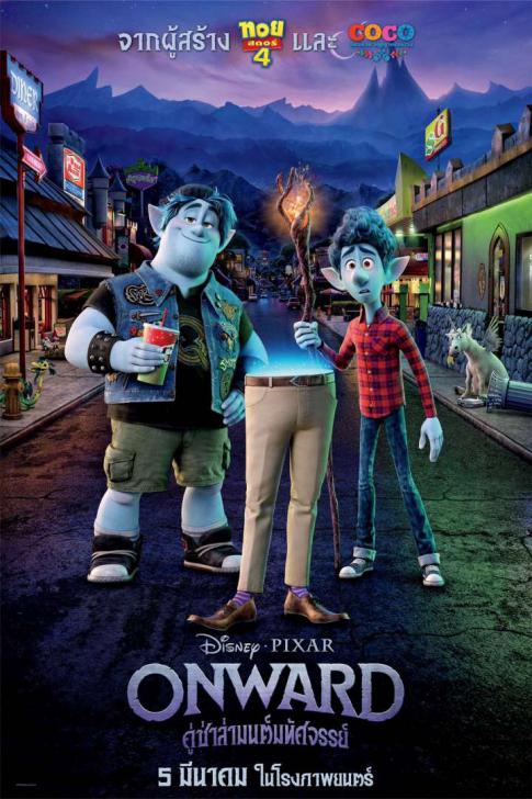 หนัง Onward หรือชื่อไทยว่า คู่ซ่าล่ามนต์มหัศจรรย์ เรื่องราวโลกเวทมนต์ กับเอลฟ์สองพี่น้องที่ได้รับของจากพ่อที่หายสาบสูญไป และของขวัญชิ้นนั้นสามารถทำให้พ่อกลับมาได้ แต่ทั้งคู่กลับนำพ่อกลับมาได้แค่ครึ่งล่างเท่านั้น ทำให้พวกเขาต้องออกเดินทางตามหาเวทมนตร์วิเศษที่หลงเหลืออยู่ภายใน 24 ชม. กับการผจญภัยที่เต็มไปด้วยความแฟนตาซี