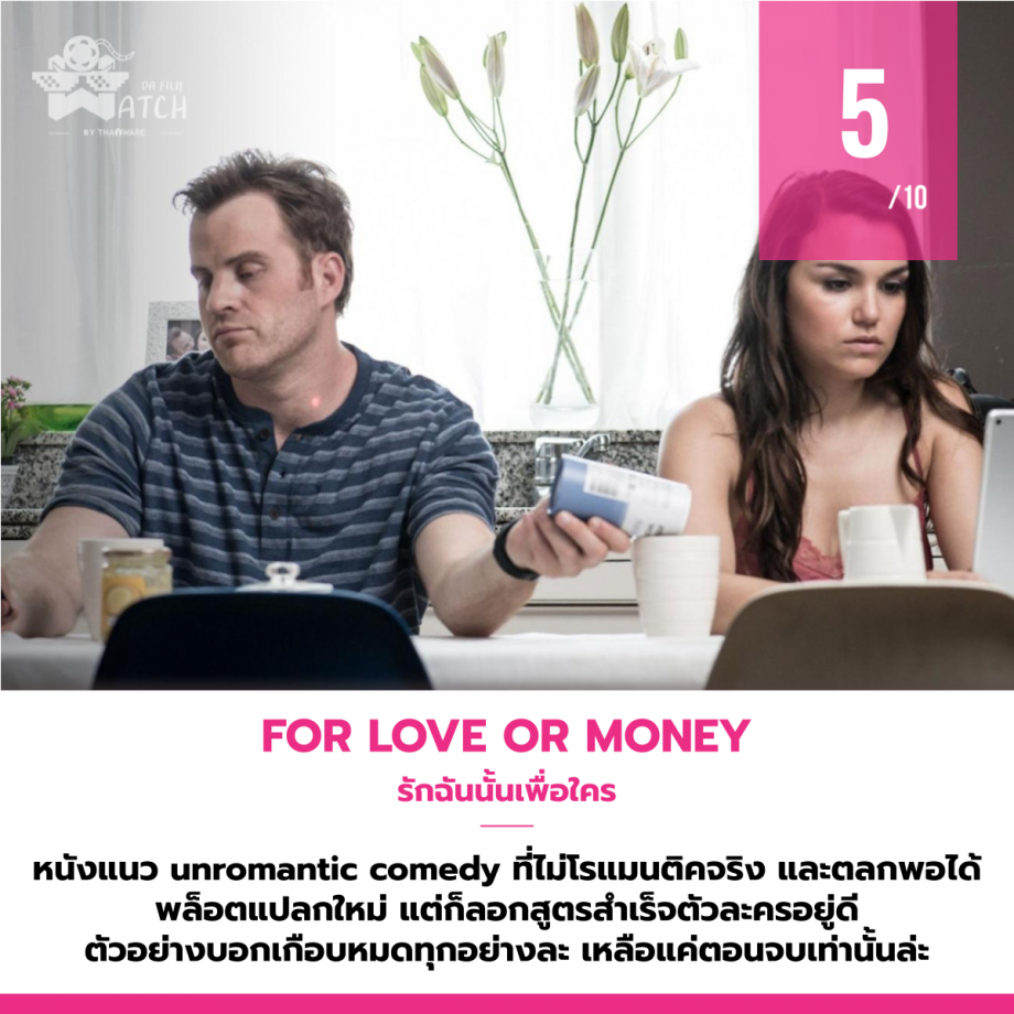 หนัง For Love or Money หรือชื่อไทยว่า รักฉันนั้นเพื่อใคร "ชีวิตคู่จะดี ถ้าไม่มีเรื่องเงินเข้ามาเกี่ยว" ดั่งที่ใครหลายคนเคยบอกไว้ #ForLoveOrMoney #รักฉันนั้นเพื่อใคร ภาพยนตร์โรแมนติกคอมเมดี้จากเกาะอังกฤษ นำเสนอชีวิตรักระหว่าง Mark และ Connie ที่เหมือนทุกอย่างจะเป็นไปได้สวย จนกระทั่งอีกฝ่ายหนึ่งค้นพบว่า การตกหลุมรักกันของพวกเขาทั้งสองเป็นเรื่องเงินๆทองๆซะอย่างนั้น สงครามประสาทแห่งการแก้แค้นเอาคืนจึงได้เริ่มต้นขึ้น