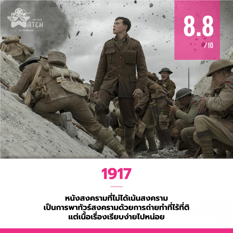 1917 เรื่องราวว่าด้วยสมัยสงครามโลกครั้งที่ 1 เมื่อสายสืบได้ข่าวว่า ฆ่าศึกได้เตรียมการถล่มแนวหน้า จะต้องส่งทหารไปส่งข่าวระงับการบุกในวันรุ่งขึ้น ถ้าทหารนำสารไม่สามารถไปถึงได้ทันเวลาจะมีคนตายมากมาย ถึงแม้เรื่องราวจะดูเรียบง่ายไม่ค่อยมีอะไร แต่ด้วยการถ่ายถอดแบบ Long-Take ทำให้หนังมันน่าสนใจมาก