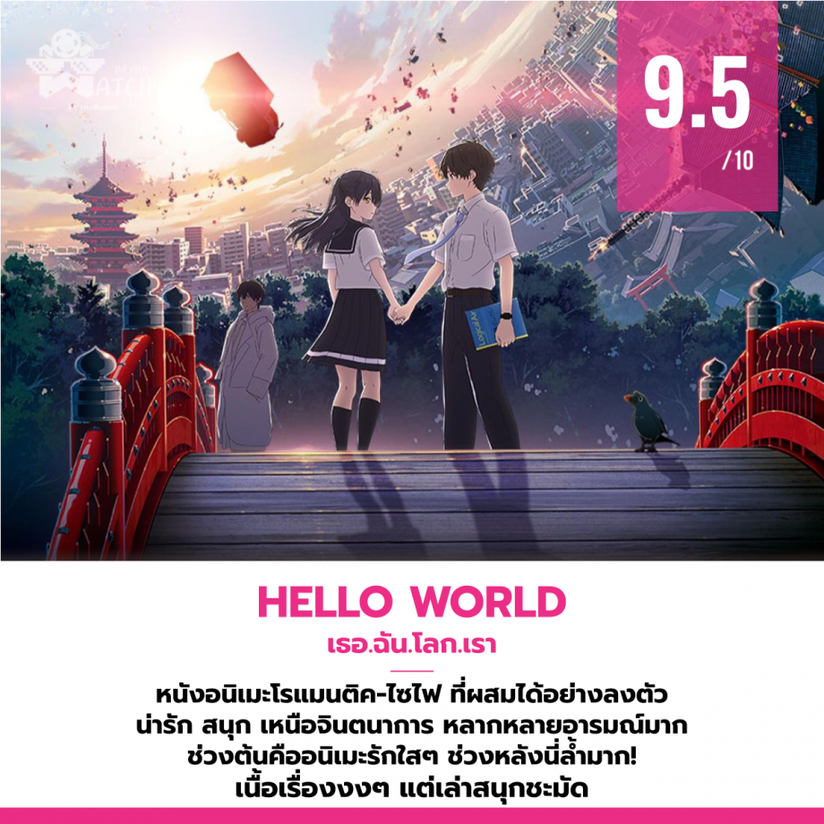 Hello World เป็นหนังอนิเมะจากญี่ปุ่นเป็นผลงานการกำกับของ โทโมฮิโกะ อิโต้ ที่เคยกำกับอนิเมะชื่อดังอย่าง Sword Art Online โดยในเรื่องนี้จะเป็นหนังอนิเมะแนวโรแมนติค ไซไฟ ที่ล้ำและเหนือจินตนาการมาก จริงๆ ไม่อยากเล่าอะไรมากเดี๋ยวจะเป็นการสปอยล์เสียเปล่า เอาเป็นว่าเล่าตามตัวอย่างเนอะ มันเป็นเรื่องราวของชายคนหนึ่งที่ได้พบกับตัวเองที่เดินทางมาจากอนาคต ซึ่งชายที่เดินทางมาจากอนาคตก็จะมาช่วยเขาจีบผู้หญิงคนนึงที่จะกลายมาเป็นแฟนของเขาในอนาคต เท่านั้นยังไม่พอ ตัวผู้ชายในอนาคตก็บอกว่าผู้หญิงจะตายหลังจากคบกันได้ไม่นาน ทำให้เขาต้องปกป้องผู้หญิงคนนี้ให้มีชีวิตรอดปลอดภัยด้วย พยายามจะไม่สปอยล์สุดๆ ละ มันไซไฟยังไง มันล้ำยังไง ไปหาคำตอบกันเองดีกว่า ถ้าพูดไปอาจหลุดสปอยล์ได้เลย