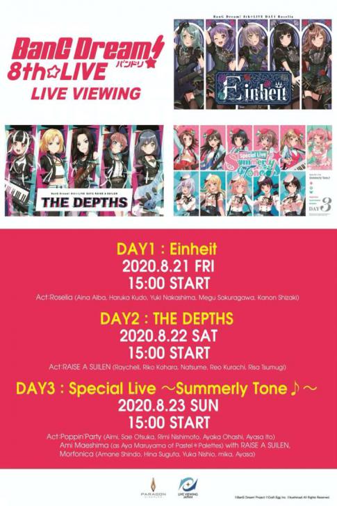 หนัง BanG Dream 8 th LIVE คอนเสิร์ต 3 วันที่จะจัดขึ้นในวันที่ 21-23 สิงหาคม 2020 ที่จะถ่ายทอดสดผ่านโรงหนัง โดย BanG Dream! คือโปรเจคระหว่างอนิเมะที่จะลิงค์กับคอนเสิร์ตจริงๆ และนี่ก็จัดเป็นครั้งที่ 8 แล้ว