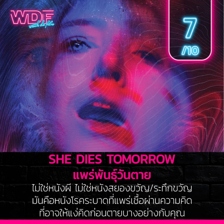 She Dies Tomorrow เป็นเรื่องราวเกี่ยวกับผู้หญิงคนหนึ่งที่คิดว่าพรุ่งนี้ตัวเองกำลังจะตาย เธอจึงได้บอกเล่าเรื่องราวนี้กับเพื่อนของเธอ แต่เหมือนมันจะกลายเป็นเชื้อร้ายที่แพร่ความหวาดกลัวให้กับผู้คนที่ได้ยินมัน!