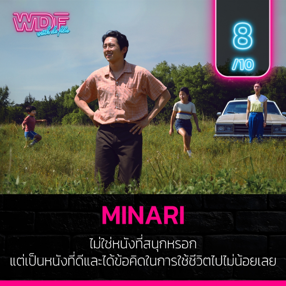สรุปแล้ว Minari ไม่ใช่หนังที่สนุก แต่ถือว่าเป็นหนังที่ให้ข้อคิดดี ๆ กับเราเรื่องนึงเลย ทั้งนี้ทั้งนั้นโดยส่วนตัวก็ยังมองว่ามันไม่กลมกล่อมอยู่ดี หลาย ๆ ซีนยังไม่สามารถส่งอารมณ์มาถึงเราได้ขนาดนั้น คือเข้าใจทุกอย่างที่เกิดขึ้นนะ แต่ยังพาเราไปสัมผัสหรืออินตามได้ไม่มากพอ มันไม่ใช่หนังที่จะบอกให้คุณลุกขึ้นมาเผชิญหน้ายอมรับชะตากรรมต่าง ๆ แต่มันคือหนังที่บอกให้คุณดำเนินชีวิตแบบเรียบง่าย ปรับตัว ยอมรับการเปลี่ยนแปลงในทุกอย่างที่จะเข้ามาในชีวิต เหมือนดั่งที่ในหนังบอกเอาไว้ถึงต้น มินาริ ว่ามันคือวัชพืชที่ที่ปลูกได้ทุกที่ มันก็สามารถเติบโตและเจริญงอกงามได้อย่างรวดเร็ว ไม่ว่าจะโดนลม ฝน แดดมากสักเท่าไหร่ มันก็ยังคงงอกงามอยู่เสมอ...นี่แหละคือสิ่งที่หนังเรื่องนี้ต้องการจะบอก