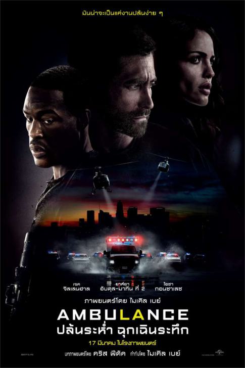 หนัง Ambulance หรือชื่อไทยว่า ปล้นระห่ำ ฉุกเฉินระทึก เวลากว่า 1 วัน บนท้องถนนในลอสแองเจลิส ทำให้ชีวิตของคน 3 คน เปลี่ยนแปลงไปตลอดกาล ในภาพยนตร์ทริลเลอร์สุดระทึกจากผู้สร้างและผู้กำกับไมเคิล เบย์ เรื่องราวของวิล ชาร์ป (เจ้าของรางวัลเอ็มมี่ ยายาห์ อับดุล-มาทีน ที่ 2 จาก Candyman, The Matrix Resurrections ) ทหารผ่านศึกผู้ได้รับประดับเหรียญเกียรติยศ กำลังหมดหวังกับการหาเงินมาจ่ายค่ารักษาพยาบาลของภรรยา เขาจึงขอความช่วยเหลือจากบุคคลหนึ่งที่เขารู้จัก แต่เขาไม่ควรติดต่อ นั่นก็คือ แดนนี่ น้องชายบุญธรรมของเขา (ผู้ได้รับการเสนอชื่อเข้าชิงรางวัลออสการ์ เจค จิลเลนฮาล จาก Zodiac, Spider-Man: Far From Home) แดนนี่ คืออาชญากรอาชีพ ผู้มีเสน่ห์ดึงดูดใจ แต่แดนนี่กลับยื่นข้อเสนอ ให้มาร่วมปล้นธนาคารซึ่งนับว่าเป็นครั้งใหญ่ที่สุดในประวัติศาสตร์ลอสแองเจลิส ด้วยเดิมพัน 32 ล้านเหรียญสหรัฐฯ ทำให้วิลไม่สามารถปฏิเสธได้ เพราะต้องช่วยภรรยาให้รอดชีวิต แต่เมื่อการหลบหนีของพวกเขาเกิดผิดพลาด สองพี่น้องที่สิ้นหวังก็ได้จี้รถพยาบาล ที่มีตำรวจบาดเจ็บปางตายติดอยู่และ แคม ธอมสัน เจ้าหน้าที่หน่วยแพทย์ฉุกเฉิน (ไอซา กอนซาเลซ, Fast & Furious Presents: Hobbs & Shaw, Baby Driver) กำลังทำหน้าที่ประจำการอยู่ ในการไล่ล่าด้วยความเร็วสูงที่ไม่เคยหยุดนิ่ง วิลและแดนนี่ต้องหลบเลี่ยงการตอบโต้ของหน่วยงานบังคับใช้กฎหมาย เพื่อรักษาตัวประกันให้รอดชีวิต และพยายามอย่าฆ่ากันเอง นี่คือปฏิบัติการการหลบหนีที่บ้าคลั่งที่สุดในลอสแองเจลิสเท่าที่เคยเห็นมา Ambulance ปล้นระห่ำ ฉุกเฉินระทึก อำนวยการสร้างโดย ไมเคิล เบย์ ,พี.จี.เอ., แบรดลีย์ เจ.ฟิชเชอร์, พี.จี.เอ. (Zodiac, Shutter Island) จาก นิว รีพับบลิค พิคเจอร์ส, เจมส์ แวนเดอร์บิลด์ (Zodiac, 2022’s Scream), วิลเลียม ชีรัค (Ready or Not, 2022’s Scream) และผู้ได้รับเสนอชื่อชิงรางวัลออสการ์ เอียน ไบรซ์ (Transformers franchise, Saving Private Ryan) ภาพยนตร์เขียนบทโดย คริส ฟีดัค จากเรื่องเดิมและบทจากภาพยนตร์จากเดนมาร์กเรื่อง Ambulancen โดยลอริทส์ มันช์-ปีเตอร์เซ็น และลาร์ส แอนเดรียส พีเดอร์เซ็น