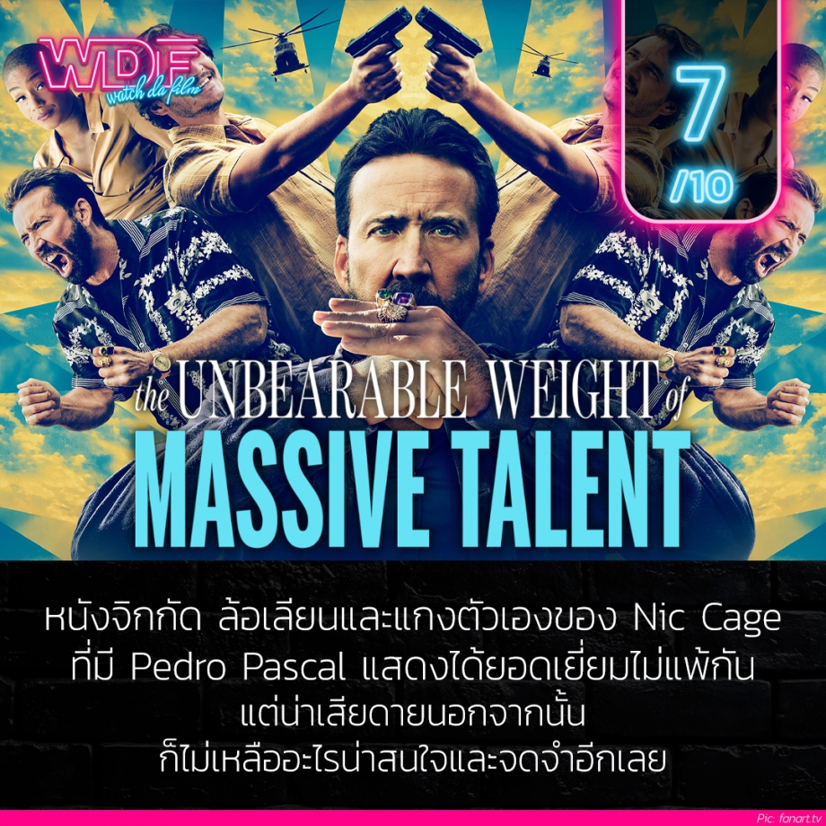 หนัง The Unbearable Weight of Massive Talent หรือชื่อไทยว่า ข้านี่แหละ นิค ฟักกลิ้ง เคจ ภาพยนตร์เรื่องนี้เล่าถึง ‘นิโคลัส เคจ’ (รับบทโดยนิโคลัส เคจ) ดาราฮอลลีวูดรุ่นใหญ่ตกอับ ที่แม้ว่าในอดีตจะเคยฝากผลงานอันยิ่งใหญ่เอาไว้มากมายทั้ง Con Air และ Face/Off แต่เขากลับต้องมาเผชิญช่วงเวลาที่ยากลำบากไม่มีใครจ้างงาน จนต้องจำใจยอมรับข้อเสนอที่ไม่น่าไว้วางใจให้เดินทางไปร่วมงานวันเกิดของมหาเศรษฐีชาวเม็กซิกันแลกกับเงินหนึ่งล้านดอลลาร์สหรัฐ ฯ และเขาก็พบว่ามหาเศรษฐีคนนี้เป็นแฟนพันธุ์แท้ของตัวเขาเอง แต่เรื่องราวสุดวายป่วงยังไม่จบลงแค่นี้ เมื่อเคจพบว่าภายใต้หน้ากากแฟนพันธุ์แท้ ‘นิค เคจ’ มหาเศรษฐีคนนี้คือ เจ้าพ่อค้ายารายใหญ่ที่เป็นที่ต้องการตัวของ CIA นั่นทำให้เขาถูกหมายหัวในฐานะผู้สมรู้ร่วมคิด เคจต้องตกกระไดพลอยโจนสวมบทบาทในอดีตที่เคยสร้างชื่อให้กับเขาเพื่อหาทางเอาตัวรอดจากสถานการณ์นี้ไปให้ได้