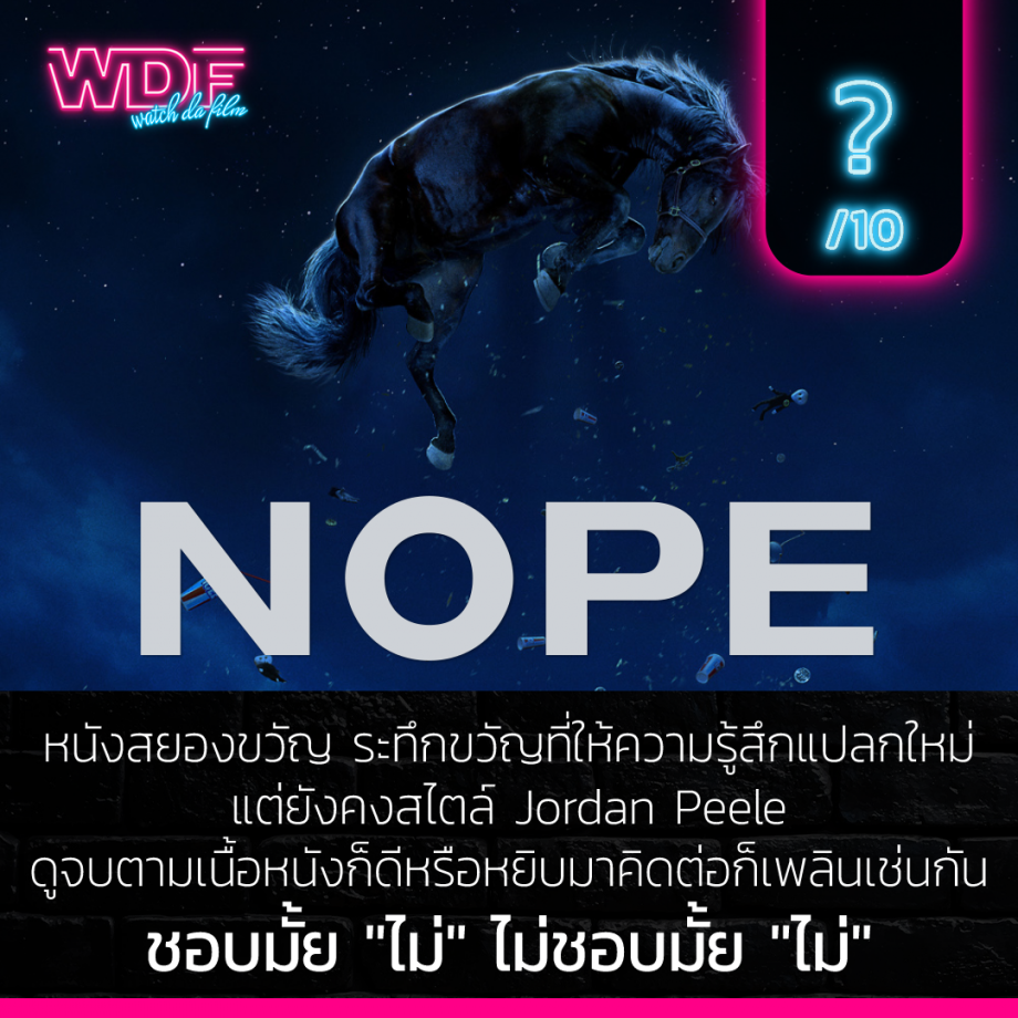 สรุปแล้ว Nope - ไม่ เป็นหนังที่เปิดประสบการณ์ใหม่ ๆ เหมือนกัน มันได้อรรถรสมากในเรื่องของภาพและเสียงจัดเต็มมากจริง ๆ ลองมองแบบตามเนื้อหนังไม่ได้ลงลึกอะไรมันก็ยังโอเคสร้างความหวาดผวา เซอร์ไพรส์อีก และพอมาพูดถึงเรื่องต่าง ๆ ก็หยิบจับมาพูดคุยได้สนุกเหมือนกัน เดาว่าน่าจะมีทั้งคนชอบและไม่ชอบหนังเรื่องนี้แตกต่างกันอย่างสิ้นเชิงแน่นอน ซึ่งตอนแรกเราก็รู้สึกเฉย ๆ นะ แต่พอได้มาลองนึกนู่นนี่นั่นดู เออมันก็จริงและเจ๋งดีแหะ แต่ถึงกระนั้นเราก็ไม่รู้จะให้คะแนนหนังเรื่องนี้ยังไง ถามว่าชอบมั้ยก็ตอบว่า "ไม่" แล้วถ้าถามว่าไม่ชอบมั้ย ก็ตอบว่า "ไม่" อีกนั่นแหละ