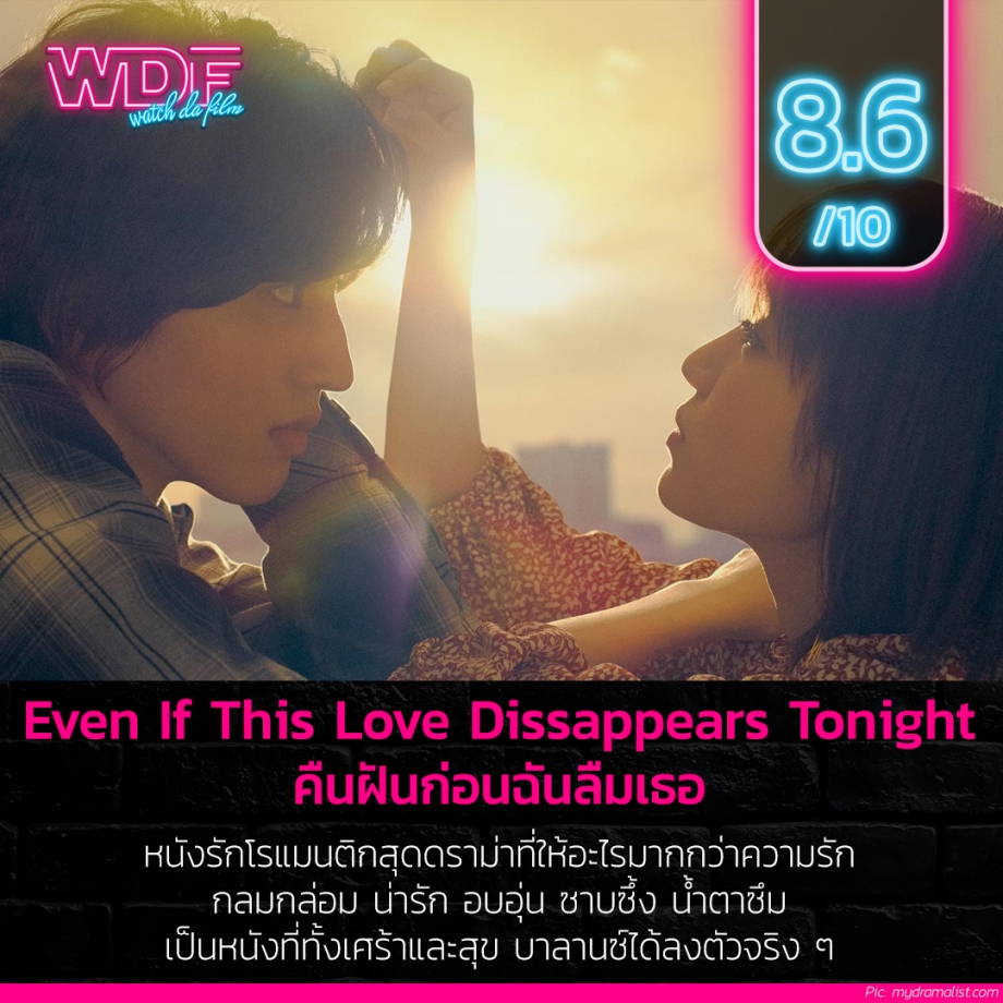 หนัง Even If This Love Disappears Tonight หรือชื่อไทยว่า คืนฝันก่อนฉันลืมเธอ ภาพยนตร์เรื่องราวความรักเกี่ยวกับความทรงจำที่จะเรียกน้ำตาจากทุกคน "คืนฝันก่อนฉันลืมเธอ” ได้ถือกำเนิดขึ้นแล้ว เรื่องราวความรักอันเลือนรางและเจ็บปวดของนางเอกผู้มี “ภาวะสูญเสียความทรงจำไปข้างหน้า” ซึ่งจะทำให้สูญเสียความทรงจำทุกครั้งที่หลับ กับพระเอกผู้คอยทุ่มเทช่วยเหลือเธอ แต่ในขณะเดียวกันตัวเองก็มีความลับที่ปิดบังไว้ "Even If This Love Disappears Tonight" "คืนฝันก่อนฉันลืมเธอ"