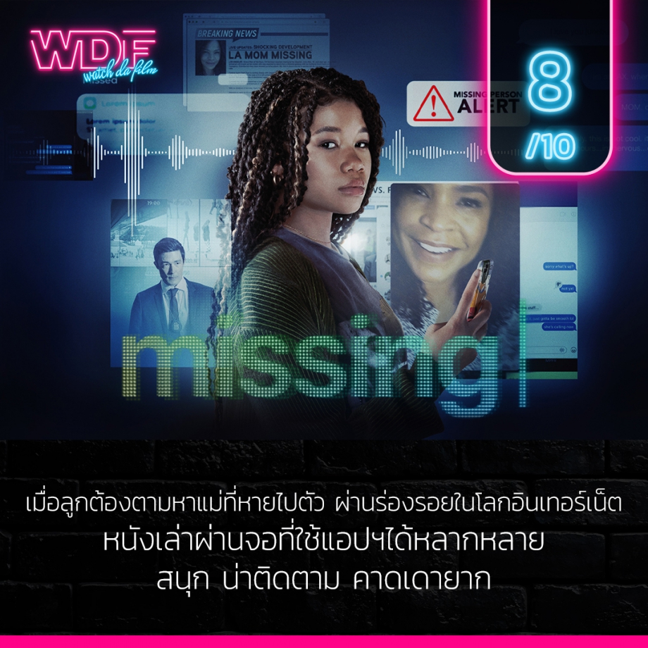 หนัง Missing หรือชื่อไทยว่า เสิร์ชหา...แม่หาย จากทีมงานผู้สร้าง Searching... ภาพยนตร์เรื่อง Missing เสิร์ชหา...แม่หาย!? ปริศนาลุ้นระทึก ที่ทาให้คุณสงสัยว่าคุณรู้จักคนใกล้ชิดที่สุดกับคุณดีแค่ไหน ในระหว่างที่แม่ของเธอ (นีอา ลอง) หายตัวไประหว่างเที่ยวพักผ่อนในโคลอมเบียกับแฟนใหม่ การค้นหาคาตอบและตามหาแม่ของจูน (สตอร์ม รี้ด) นั้นไม่ง่ายเลย ด้วยความที่เธออยู่ในลอสแอนเจลิสที่ห่างไกลจากประเทศที่แม่ไปเที่ยว จูนจึงต้องใช้เทคโนโลยีใหม่ต่างๆ นาๆ เพื่อพยายามหาตัวแม่ให้พบก่อนทุกอย่างจะสายเกินไป การสืบเสาะหาร่องรอยบนโลกดิจิตอลของเธอนาไปสู่ ความลับสุดระทึกและเรื่องหลอกลวงที่สุดจะคาดเดา