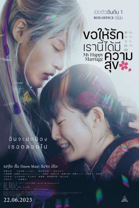 ภาพยนตร์ Live-Action จากมังงะและไลท์โนเวล My Happy Marriage ขอให้รักเราได้มีความสุข เรื่องราวของมิโยะ (รับบทโดย อิมาดะ มิโอะ) หญิงสาวที่เกิดมาในตระกูลชั้นสูงที่ล้วนมีพลังพิเศษ ทว่าเธอกลับไร้พลัง ภายหลังจากที่แม่ของเธอเสียชีวิต พ่อของเธอก็กลับไปแต่งงานกับคนรักเก่า และไม่สนใจใยดีอะไรเธออีกต่อไป ปล่อยให้ภรรยาใหม่และลูกสาวคนเล็กที่มีพลังเนตรเห็นอสูรแต่กำเนิด คอยกดขี่ข่มเหงเธอต่าง ๆ นา ๆ จนวันหนึ่งเธอต้องออกเรือนแต่งงานกับนายทหารหนุ่ม คิโยกะ คุโด (รับบทโดยเมกุโระ เรน) ที่ได้ชื่อว่าโหดเหี้ยมไร้ความปราณีและไม่มีหญิงสาวคนใด ทนอยู่ด้วยได้เกิน 3 วัน