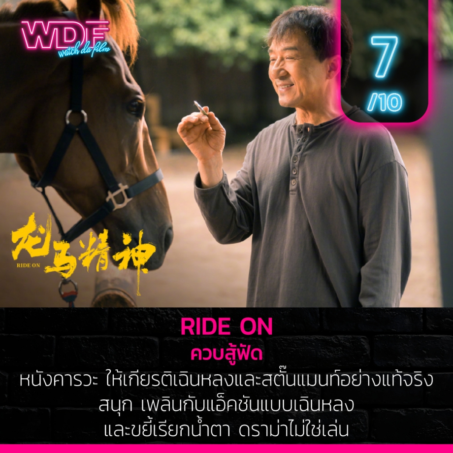 สรุปแล้ว Ride On - ควบสู้ฟัด เป็นหนังที่ดูสนุก เพลิดเพลิน บันเทิง และดราม่า ผ่านทั้งฉากแอ็คชัน การคารวะสตั๊นแมนท์ การหวนคิดถึงเรื่องราวของเฉินหลง การก้าวผ่าน การเปลี่ยนแปลงของอุตสาหกรรมหนัง และความสัมพันธ์ระหว่างคนกับสัตว์ที่ทั้งน่ารักและกินใจ มันอาจไม่ใช่หนังที่เลิศเลอเพอร์เฟ็ค แต่เรื่องราวมันก็มากพอที่จะทำให้เราตามติดและอยู่กับมันในเวลาสองชั่วโมงนิด ๆ ได้ดีเลยทีเดียว