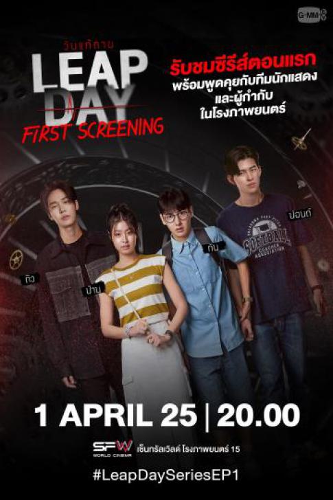 หนัง LEAP DAY : FIRST SCREENING หรือชื่อไทยว่า LEAP DAY วันแก้ตาย : FIRST SCREENING 29 กุมภาพันธ์ วันที่ 4 ปีจะมีสักหนึ่งครั้ง เราเรียกมันว่า LEAP DAY ทุกคนต่างออกมาเฉลิมฉลองกันในวันนั้น แต่ไม่ใช่กับ “เดย์” (ปอนด์ ณราวิชญ์) และ “ไนท์” (ดิว จิรวรรตน์) ที่ทุกๆ วันที่ 29 กุมภาพันธ์ หรือวันเกิดของพวกเขา คนที่พวกเขารักที่สุดจะตาย!! แต่แล้วในวันเกิดครบ 20 ปี ทั้ง “โอโซน” (กัน อรรถพันธ์) ลูกพี่ลูกน้องของ เดย์ และ “ดรีม” (ป่าน ปทิตตา พรจำเริญรัตน์) เพื่อนสาวคนสนิท กลับรอดชีวิต เดย์ และไนท์ จึงเริ่มร่วมมือกันเพื่อเอาชนะ LEAP DAY ให้ได้ แล้วพวกเขาจะจบปริศนานี้ได้หรือไม่ มาลุ้นไปพร้อมๆ กัน