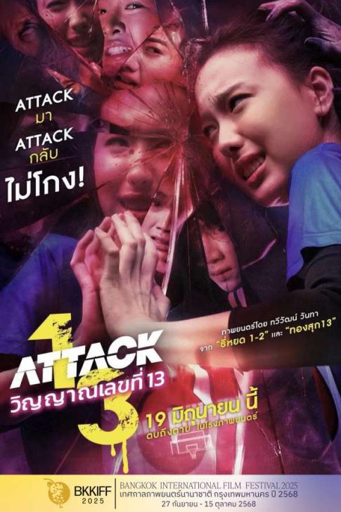 หนัง ATTACK 13 BKKIFF เขาว่าคนเรา มากกว่าโดนทำร้ายทางกาย การโดนกลั่นแกล้งดูเหมือนจะเจ็บปวดยิ่งกว่า หงส์, อร และ หยา เข้าใจมันอย่างดี เพราะพวกนางมักจะเป็นเป้านิ่งให้ บุษบา กัปตันทีมวอลเล่ย์ ทั้งตบ ลูก ทั้งตบ เพื่อน อยู่เสมอ จนกระทั่งการมาของ จิน เพื่อนร่วมทีมคนใหม่สายสตรอง ที่ไม่ยอมให้ใครมากลั่นแกล้ง พร้อมฟาดกลับแบบ ฉันไม่ใช่เหยื่อแกอีกต่อไป! แต่ถึงยังไงบุษบาก็หาเรื่องและรุนแรงขึ้นเรื่อย ๆ แต่ในเช้าวันรุ่งขึ้น บุษบา ตายในสภาพแขวนคออย่างเป็นปริศนา แต่แทนที่จะนำมาซึ่งความโล่งใจของสาวๆที่ถูกกลั่นแกล้ง มันกลับพีคยิ่งกว่าเดิม เพราะผีบุษบาตามมาบูลลี่อย่างไม่ลดละ และโหดยิ่งขึ้น เพราะเป้าหมายของบุษบาได้วางไว้คือ พวกมึงต้องตายโหงทุกคน มีเวลา 3 วัน ที่พวกเธอต้องลบล้างอาถรรพ์ผีบุษบา เมื่อผี ATTACK มา พวกเธอต้อง ATTACK กลับ ใครปลุกผีบุษบา ใครฆ่าบุษบา
